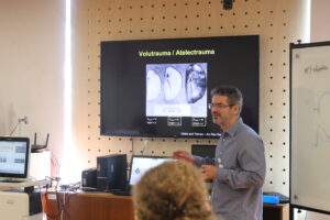 No período da tarde, o Dr. Eduardo Leite Vieira Costa conduziu as atividades ao lado do Dr. Marcelo Amato – Professor Associado e Livre-Docente da FMUSP; Diretor da UTI Respiratória do InCor/HCFMUSP; e Coordenador de Pesquisa Científica do Núcleo de Pesquisa da Rede Premium Multiusuário ME-04/LIM09 do HCFMUSP. Juntos, lideraram uma imersão prática com modelo animal, explorando estratégias avançadas de ventilação mecânica, como modos ventilatórios aplicados à SDRA, uso da tabela PEEP-FiO₂, diretrizes ARDSNet e ajustes de parâmetros conforme a mecânica pulmonar, incluindo a aplicação da posição prona.