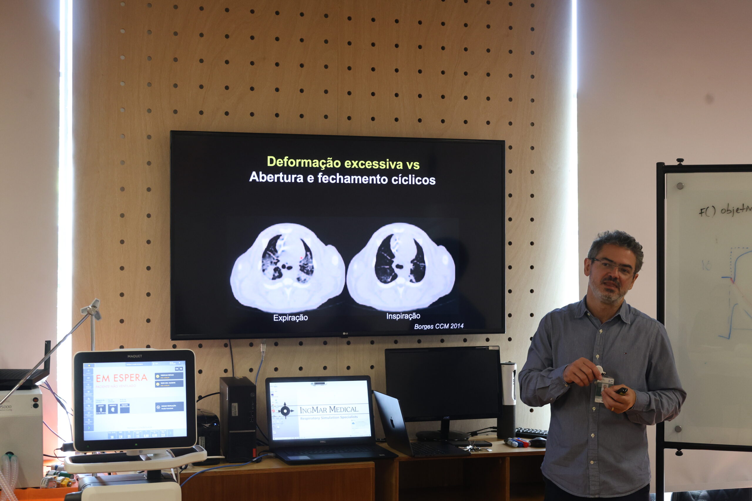 A programação matutina combinou uma revisão aprofundada dos modos ventilatórios básicos e dos princípios de ventilação protetora com uma prática de simulação de assincronias utilizando o ASL 5000, permitindo aos profissionais vivenciarem desafios comuns no manejo dos ventiladores.